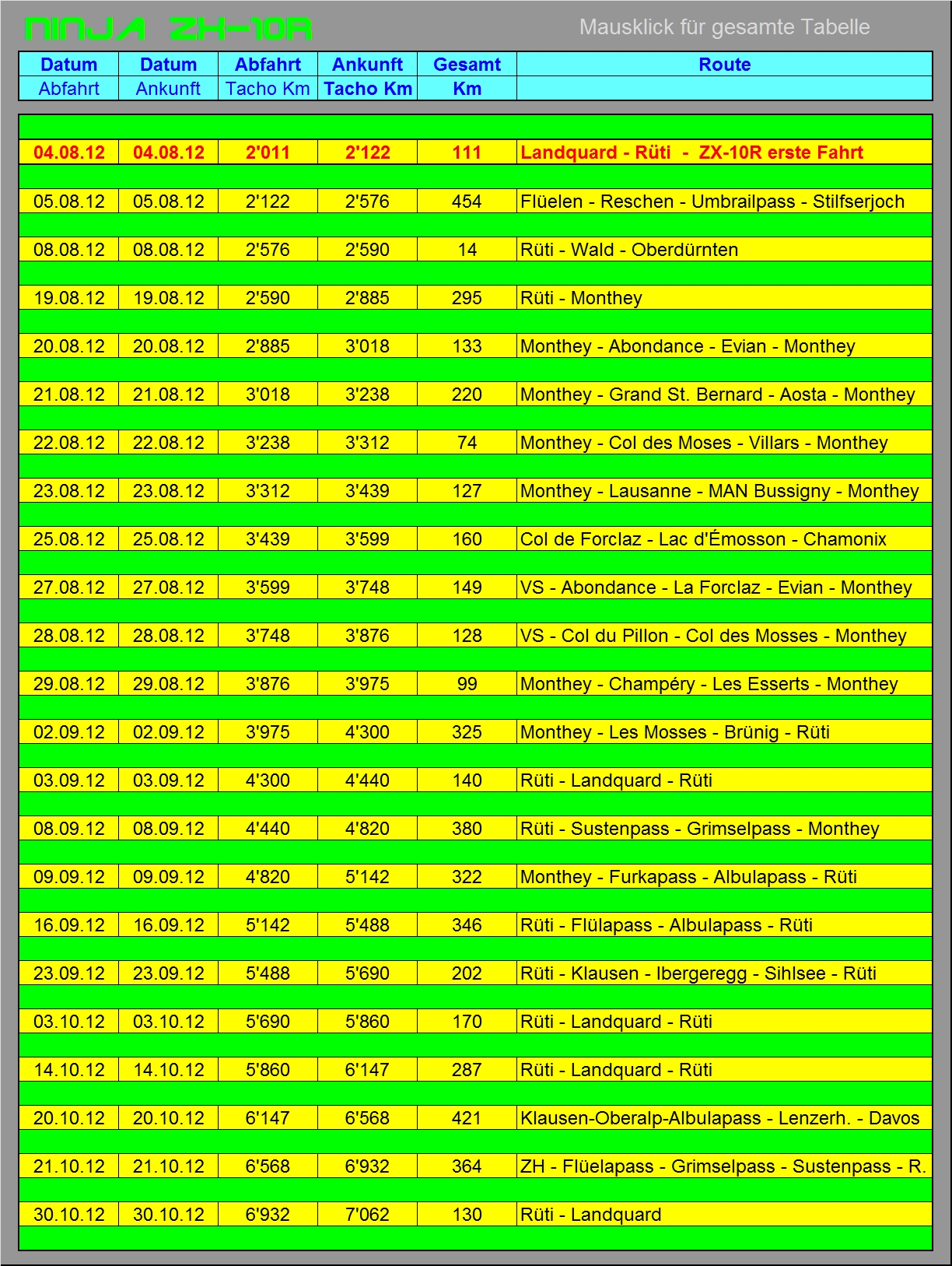 2012 mit der Ninja ZX-10R insgesamt 23 Touren gefahren - 5 051 Km